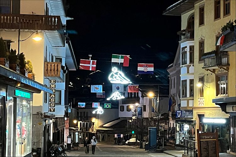 The Olympic-decorated Corso Italia in Cortina (TSX photo by Karen Rosen).